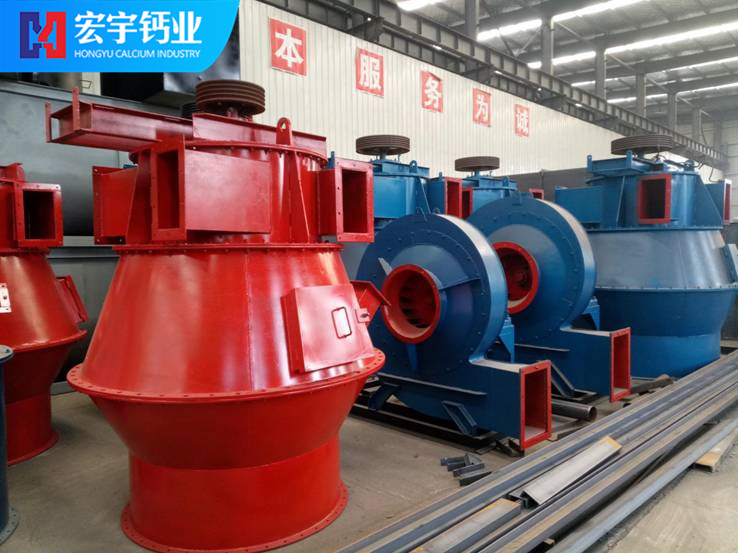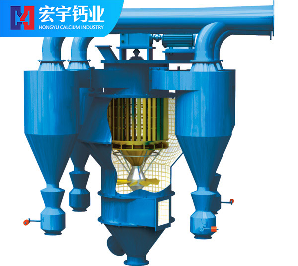 **鈣粉選粉機也叫**三分離選粉機,工作時可變速電機通過傳動裝置帶動主軸轉動,物料通過設在選粉室上部的進料口進入選粉室中心,再通過專用落料管落到選粉室下部隨主軸轉動的撒料盤上,物流在高速旋轉撒料盤的作用下,向四周均勻撒出,在外界循環風機產生的高速旋轉氣流作用下對高速拋撒的物料進行強力分散,物料中的粗重顆粒(d>150μm)受到慣性離心力的作用被甩向選粉室內壁面,碰撞后失去動能沿壁面滑下落到粗粉錐中,其余物料被旋轉氣流吹起繼續上升,經過大風葉區時又有一部分粗顆粒被分選出落入粗粉錐中。