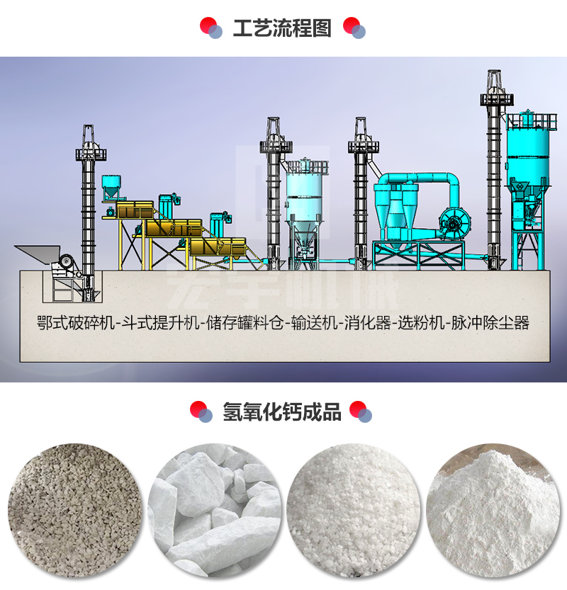 將合格的氧化鈣(CaO)塊料由鄂式破碎機破碎至20mm左右粒度,經斗式提升機送入氧化鈣儲存罐料倉,料倉中的氧化鈣經穩流輸送機定量穩重系統進入氫氧化鈣Ⅰ級消化器進行初步消化,當氫氧化鈣完成初級消化以后進入Ⅱ級消化或Ⅲ級消化器,使氧化鈣消化分解,生成合格的氫氧化鈣初級產品,消化率達到98%,(消化系統根據產能要求,機型設計分為單軸、雙軸及多軸機型)。消化分解好的氫氧化鈣再由半成品螺旋輸送機送入選粉機內,由選粉機完成產品雜質分離和細度分級,完成分級后的終端合格產品,由成品輸送機、提升機卸入成品氫氧化鈣罐倉進行分別包裝。本套生產線所有污染節點由脈沖除塵器完成,收塵率達到99.5%。