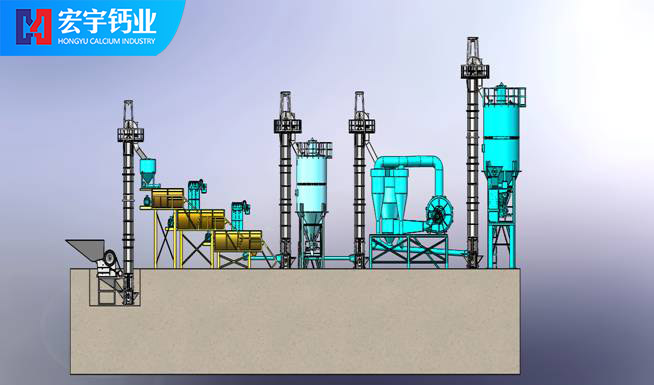 將合格的氧化鈣(CaO)塊料由鄂式破碎機(jī)破碎至40mm左右粒度,經(jīng)斗式提升機(jī)送入氧化鈣儲存罐料倉,料倉中的氧化鈣經(jīng)穩(wěn)流輸送機(jī)定量穩(wěn)重系統(tǒng)進(jìn)入氫氧化鈣Ⅰ級消化器進(jìn)行初步消化,當(dāng)氫氧化鈣完成初級消化以后進(jìn)入Ⅱ級消化或Ⅲ級消化器,使氧化鈣消化分解,生成合格的氫氧化鈣初級產(chǎn)品,消化率達(dá)到98%,(消化系統(tǒng)根據(jù)產(chǎn)能要求,機(jī)型設(shè)計分為單軸、雙軸及多軸機(jī)型)。消化分解好的氫氧化鈣再由半成品螺旋輸送機(jī)送入選粉機(jī)內(nèi),由選粉機(jī)完成產(chǎn)品雜質(zhì)分離和細(xì)度分級,完成分級后的終端合格產(chǎn)品,由成品輸送機(jī)、提升機(jī)卸入成品氫氧化鈣罐倉進(jìn)行分別包裝。本套生產(chǎn)線所有污染節(jié)點由脈沖除塵器完成,收塵率達(dá)到99.5%。